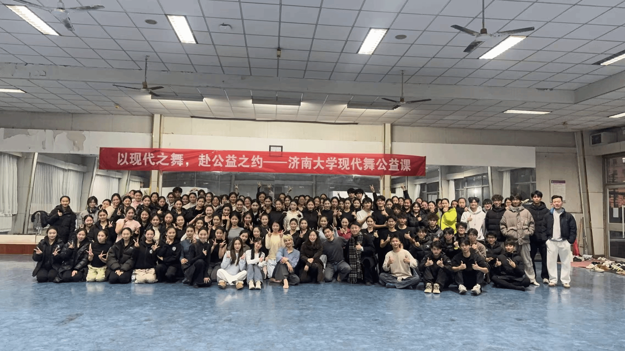 【图:济南大学现代舞公益课参与师生集体大合照】