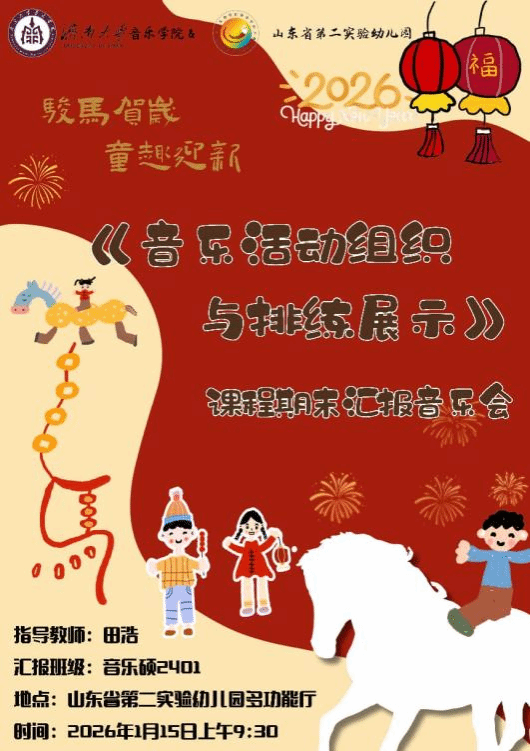 为深化音乐硕士实践育人成效,提升研究生音乐活动策划、编排与舞台呈现的综合能力,在本学期开设的《音乐活动组织与排练展示》课程中,田浩老师带领2024级研究生走进山东省第二实验幼儿园进行为期一学期的教学实践,并于2026年1月15日联合山东省第二实验幼儿园成功举办课程期末汇报音乐会。山东省第二实验幼儿园副园长刘菲、副园长郭志杰,济南大学研究生院副院长仲倩、培养办公室干事昃科萌,音乐学院副院长齐丽花、研究生办公室主任李童童、理论系主任左丹婷、声乐系副教授闵小敏、音教系副教授李展莅临此次音乐会指导,与全体2024级研究生共同见证这场凝聚课堂所学与团队心血的艺术盛宴。